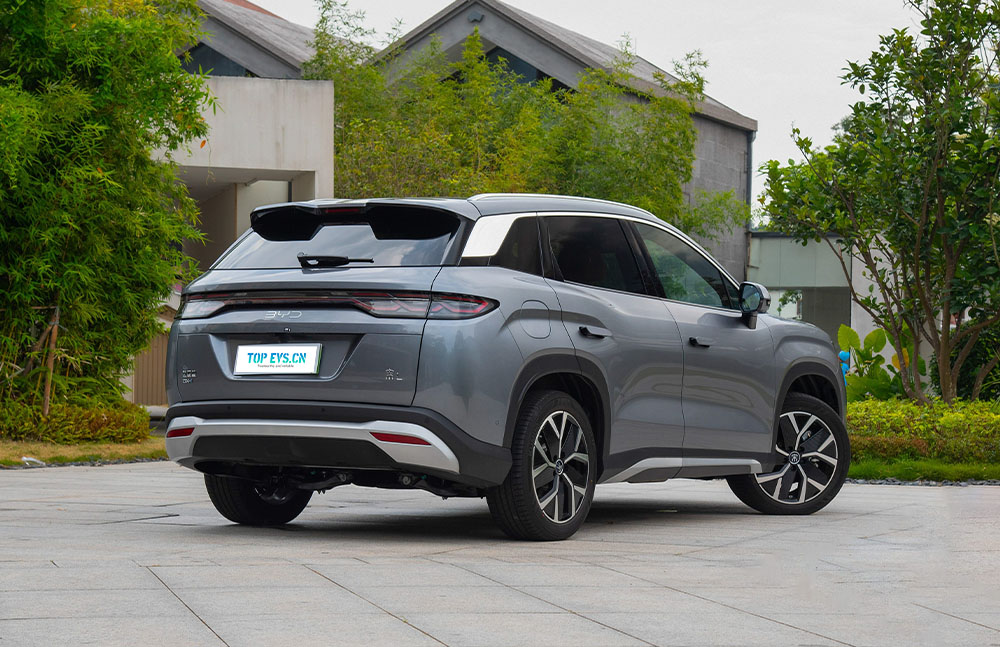 BYD Tang DM-i. The side of the body adopts a more rounded and full style, and the concave lines are added above the square wheel arches, matched with the silver trim on the side skirts, continuing to emphasize the sense of power. The slightly sloping back shape and the "dragon-colored flying wing" waistline create a posture ready to go. The addition of features such as the floating roof, hidden door handles and two-color petal-shaped wheels brings a fashionable and avant-garde attribute.