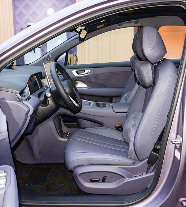 The Huawei SAIC H5 features a plunging closed front fascia, with a prominent “nose” combined with upward-slanting “L”-shaped headlights on both sides, creating a highly aggressive look. The triangular blacked-out air intakes at the bottom are outlined with “C”-shaped lines, paired with a large black trapezoidal lower grille and chrome front skid plate, enhancing the visual impact of the front. A LiDAR sensor is visible on the roof, and the vehicle is equipped with Huawei Qian Kun ADS 4, supporting high-speed/city navigation assistance and automatic parking. The air intake also integrates the “Smart Driving Blue Light,” highlighting the vehicle’s technological sophistication.