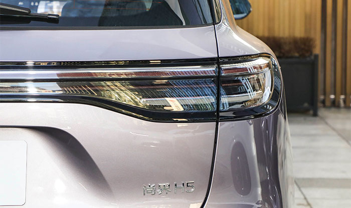 The rear of the SAIC H5 has a full, multi-layered shape, with a through-type taillight that echoes the horizontal chrome strip on the rear bumper, widening the visual effect. The black diffuser at the bottom, combined with circular airflow fins, further emphasizes the sporty character.