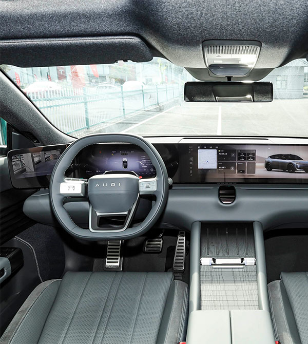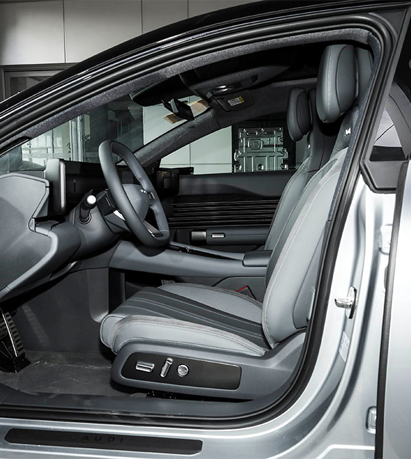 The Audi E5 Sportback 2026 Pioneer Plus adopts a closed black panel instead of a traditional grille, with circular LED daytime running lights that create dynamic welcome effects. The illuminated AUDI logo works with matrix headlights to emphasize futurism. From the side, its fastback shape is enhanced by flared wheel arches, hidden door handles, and digital side mirrors. At the rear, the circular light curtain tail lamps bring dynamic visual effects, while the hatchback trunk offers flexible storage. Inside, a 59-inch panoramic display powered by the Qualcomm Snapdragon 8295 chip pairs with the “Doubao” AI voice assistant. The long wheelbase ensures generous space, while all seats feature heating, ventilation, and massage functions for premium comfort.
