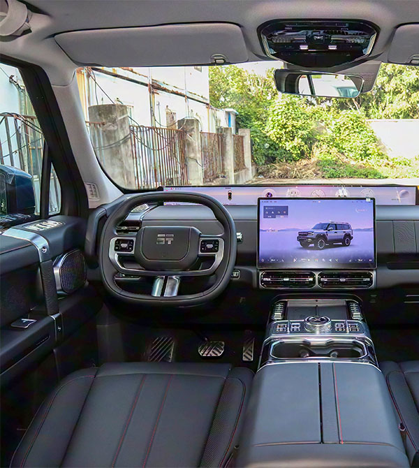 Inside, the Jetour Zongheng G700 blends rugged practicality with high-end sophistication. A 35.4-inch panoramic dashboard screen and 15.6-inch central display form the digital cockpit core. Details like the passenger-side grab handle and open storage tray reflect the vehicle’s adventurous roots. Three interior color schemes—orange, beige, and gray—combine Nappa leather upholstery with diamond stitching for refined comfort. The co-pilot’s contour lines visually echo the door handle design, while perforated hill-pattern door panels and ambient lighting strips elevate the second-row luxury feel. At the center, a crystal rotary knob and dedicated drive-control buttons integrate low-speed 4WD and differential lock functions for intuitive, tactile control.