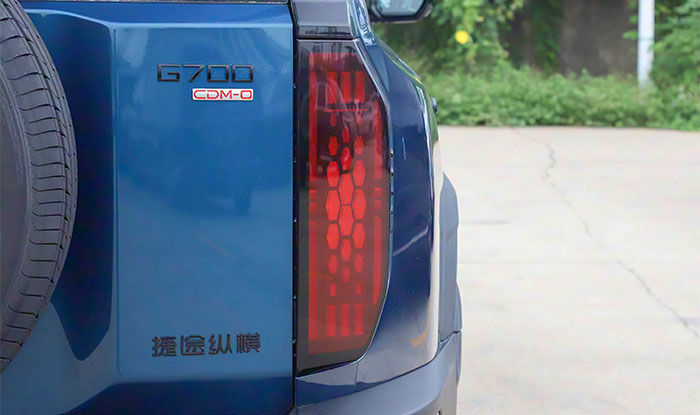 From the side, the G700 continues the squared-off aesthetic typical of hardcore SUVs. Measuring 5198mm in length and 2050mm in width, it exudes powerful visual presence. Its 2870mm wheelbase with a compact layout ensures generous rear legroom while maintaining a tight 5.8-meter turning radius. A floating roof and 20-inch dual-tone wheels enhance the visual balance, while 275/60R20 all-terrain tires and vertical fender lights command attention. The exposed ladder frame underlines its authentic off-road nature, and the contoured side skirts with Jetour G700 badging combine practicality with brand identity. The lower A-pillar features accessory ports for additional off-road lighting, and the sharply pressed character lines reinforce the SUV’s muscular stance. Paired with air suspension and a 21° approach angle, the G700 glides through urban streets yet dominates rugged trails with ease.