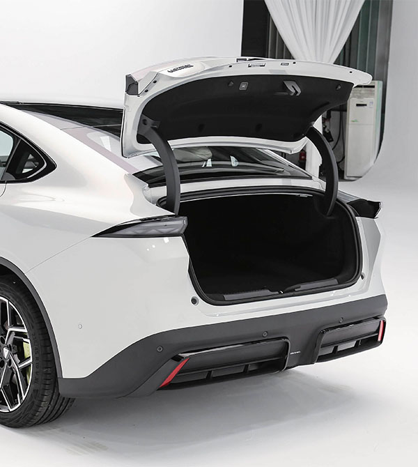 The rear design combines functionality with visual appeal. The through-type taillights feature an illuminated central brand badge, forming a seamless light strip at night for outstanding recognition. The adjustable multi-stage electric rear spoiler automatically deploys at high speeds to increase downforce and stability. A diffuser-style rear bumper completes the aerodynamic loop started at the front, while the recessed license plate area adds an extra layer of sportiness.