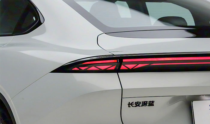 From the side, the L06 perfectly interprets the “aesthetics of flow.” The long hood and sleek fastback roofline create an elegant golden ratio silhouette, while the shoulder line runs smoothly from the fender to the tail, evoking the sense of liquid metal in motion. Subtle details such as semi-hidden door handles and ultra-narrow 5mm frameless side mirrors help reduce wind noise, while the 19-inch multi-spoke wheels with green brake calipers add a bold sporty touch. Measuring 4,830mm long, 1,905mm wide, and 1,480mm tall, with a 2,900mm wheelbase, the L06 Deepal delivers generous interior space while maintaining a low, athletic stance. Its 1,630/1,650mm front and rear track widths further enhance driving stability.