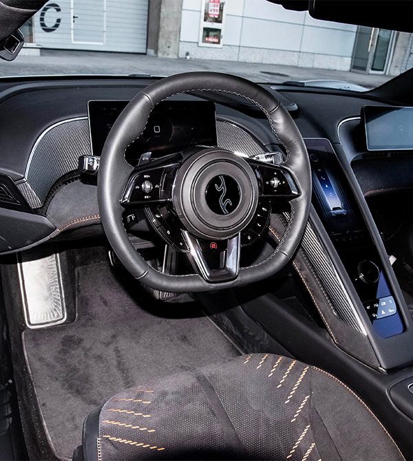 The seats reflect a balance of practicality and luxury. The 14-way power-adjustable sport seats are wrapped in suede-like material, offering excellent grip and comfort, along with 4-way lumbar support and electrically adjustable side bolsters. During aggressive driving, they deliver up to 280 N of lateral support, firmly holding the driver in place. Heating and ventilation functions further enhance comfort, eliminating the traditional drawbacks of supercar seats in extreme temperatures. Space utilization also exceeds expectations: a 185 cm-tall occupant enjoys about a fist of headroom in the front, while the two-seat rear offers up to two fists of legroom, making short trips comfortable and redefining conventional supercar space limitations.