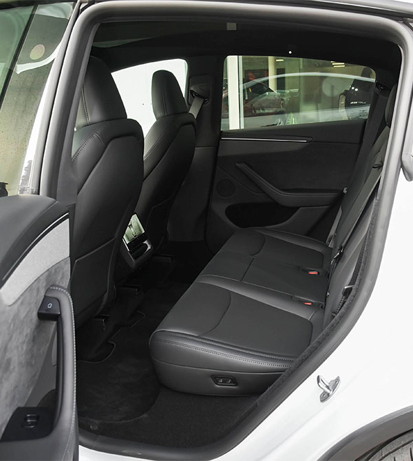 From the side, the overall stance appears more stretched and elongated. The classic fastback silhouette is retained, with a smooth line extending from the front to the rear, not only outlining an elegant body shape but also further optimizing aerodynamic performance, achieving a perfect balance between aesthetics and practicality. In terms of Tesla Model Y rims, the vehicle comes standard with 19-inch “Interactive Storm” low-drag wheels. The closed wheel design combined with low-noise tires effectively reduces energy consumption and minimizes road noise entering the cabin, enhancing ride quietness. Users can also opt for 20-inch “Spiral Storm” sport wheels to further strengthen the vehicle’s sporty visual impact and express individuality. The roof rails adopt a hidden design, maintaining clean body lines without compromising practicality. Together with blacked-out window trims and chrome accents along the lower doors, the contrast between dark and bright elements adds refinement and a premium feel to the minimalist design. The proportions remain well balanced, with a long wheelbase and short overhangs significantly improving interior space utilization compared to same-length gasoline SUVs. Rear legroom and headroom are generous, perfectly suited for daily family use and long-distance road trips. The cabin also thoughtfully reserves space for a Tesla Model Y spare tire, enhancing practicality for long journeys and emergency needs.