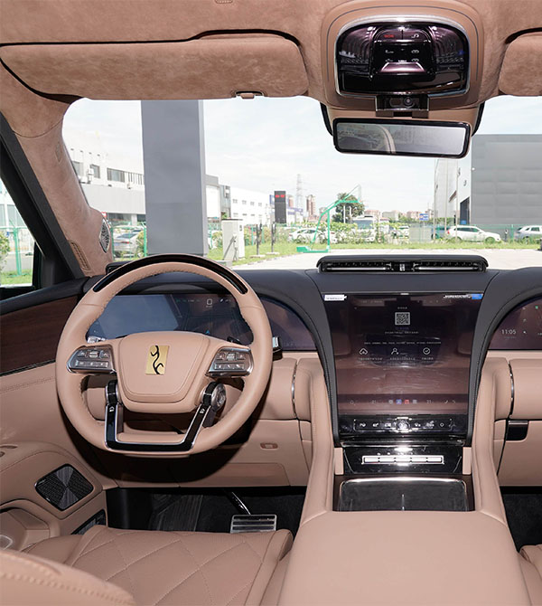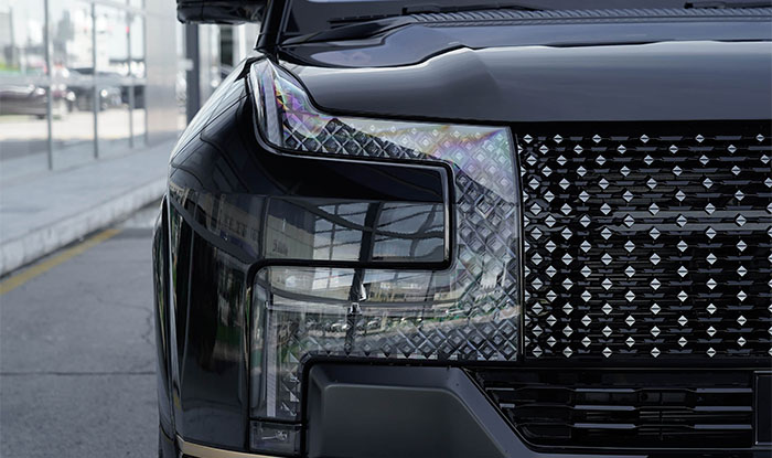 The front-end design of the BYD Yangwang U8 L Ultimate Edition represents a pinnacle fusion of modern industrial aesthetics and profound Eastern cultural heritage. It is not only a visual focal point but also rich in expressions of prestige and technological ingenuity. A design language centered around the “Ding” runs throughout: a precise array of 198 diamond-shaped LED light beads outlines a dignified and imposing “Ding”-shaped silhouette, which, when illuminated, resembles a colossal ritual vessel standing tall and radiating an aura of quiet authority. The 24K pure gold–crafted oracle-bone-script “Electric” emblem, combined with multiple gold decorative accents across the body, not only reinforces its executive-level luxury positioning but also elevates its sense of prestige to the fullest. Beneath the full and commanding front profile, the blacked-out front bumper and minimalist wheel-arch design subtly soften the ruggedness typical of off-road vehicles. The LED daytime running lights work in harmony with the adaptive high- and low-beam system, ensuring nighttime driving safety while enhancing overall refinement. The roof-mounted triple-lidar layout resembles an ancient beacon tower, serving both as the hardware core of advanced intelligent driving and a highly recognizable design signature on the front fascia, achieving a perfect balance between luxury and technology.