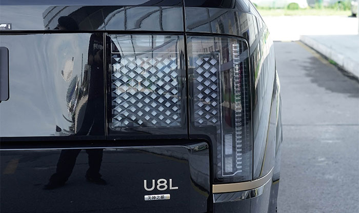 At the rear, the Yangwang U8 L 2025 redefines the functional aesthetics of full-size SUVs with its “Heaven Gate and Earth Gate” split tailgate structure. After eliminating the externally mounted spare tire, the tailgate adopts a vertically split design: the upper tailgate opens up to 90 degrees and is equipped with an electric sunshade, instantly transforming into an open-air viewing platform; the lower tailgate supports up to 200 kg and unfolds into a 1.2 m × 0.8 m leisure platform. Paired with hidden folding seats, it perfectly embodies the Eastern concept of relaxed social moments at the rear of the vehicle. The taillight assembly uses a full-width black crystal panel, with 198 LED light beads inside echoing the “Ding” motif of the front fascia. When illuminated at night, it appears deep and mysterious, like the patterns on a bronze Ding.