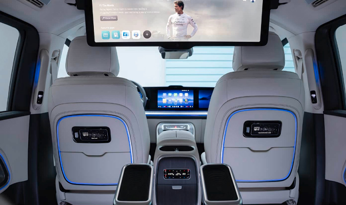 Luxurious features include a 31.3-inch 8K panoramic display, Berlin sound system, fridge, and fragrance system, creating an immersive experience.