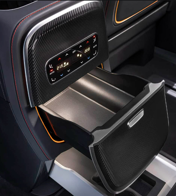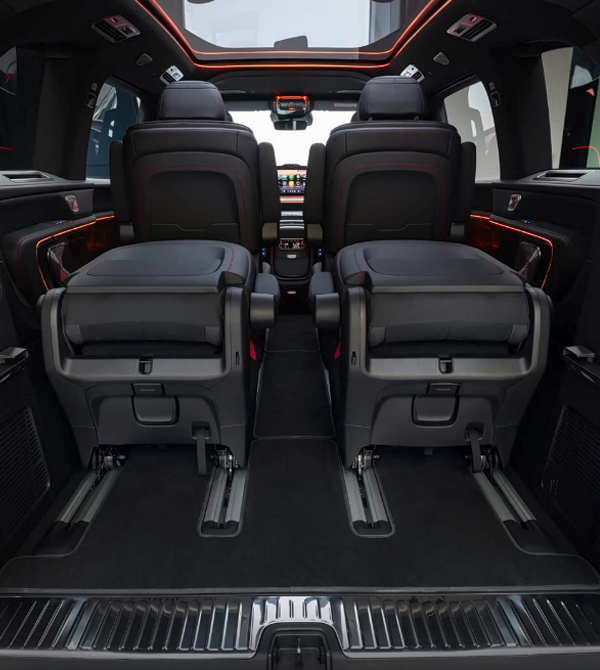 Flexible seating options with 5-8 seats and electrically adjustable rows. The second row features independent seats, with high-end versions offering airline-grade seats with leg rests, heating, ventilation, and massage. The “Roll & Go” function allows flexible seat removal for varying passenger or cargo needs.