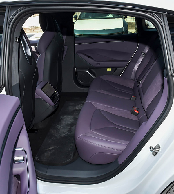 The side profile continues the minimalist surface philosophy, with a single character line extending from the front fender to the taillights, outlining an elegant and flowing fastback silhouette. Blacked-out A/B pillars combined with chrome window trim create a floating roof effect, while the front fender trim cleverly integrates side-view cameras, achieving a high level of harmony between function and aesthetics. The entire lineup comes standard with 20-inch wheels: the rear-wheel-drive version features low-drag rims with black brake calipers, while the all-wheel-drive version upgrades to sport wheels with striking orange calipers, further enhancing its sporty character. With body dimensions of 5017×1970×1427 mm and a wheelbase of 3008 mm, it significantly surpasses the similarly priced Tesla Model 3 in both presence and interior space.