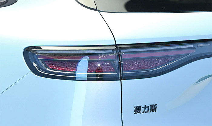 From the side, the AITO M6 fully showcases its sporty character. A smooth waistline extends from the front fender to the rear, paired with semi-hidden door handles and 21-inch petal-style five-spoke wheels. The red brake calipers embedded within the wheels further emphasize a dynamic, ready-to-launch stance. Although the fastback design slightly compromises rear headroom, the designers have optimized the triangular rear window at the C-pillar to ensure convenient entry and exit for rear passengers in the five-seat layout. With a body length of 4850 mm and a wheelbase of 2900 mm, it performs impressively within its class—more agile than the AITO M5 and more compact than the AITO M7—making it well-suited for both daily urban commuting and family travel.
