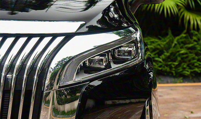 From the side, a 5,050 mm overall length paired with an ultra-long 3,085 mm wheelbase gives this five-meter-class MPV outstanding maneuverability, with a turning radius of only 5.7 meters. The floating roof and segmented character line create a nimble silhouette; multi-spoke wheels and chrome side-skirt trim enhance perceived refinement. Downward-sloping angular lines and broad chrome trim at the bottom of the doors mutually reinforce each other, producing strong visual layering. It is worth noting that the 1,900 mm height improves clearance in underground garages, and the 1,960 mm overall width leaves ample lateral space for three adults to sit side-by-side in practice.