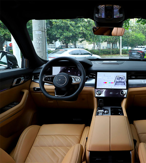 Inside, the Lynk & Co 09 merges Scandinavian minimalism with Eastern luxury. The horizontally oriented T-shaped dashboard integrates a 12-inch floating touchscreen and a 12.3-inch digital instrument cluster, powered by the Qualcomm Snapdragon 8155 chip for smooth and responsive operation. The dashboard is wrapped in premium Nappa leather with double stitching, complemented by aluminum panels and laser-etched ambient trim for layered visual texture. The perforated leather-wrapped steering wheel ensures both tactile comfort and intuitive control.
