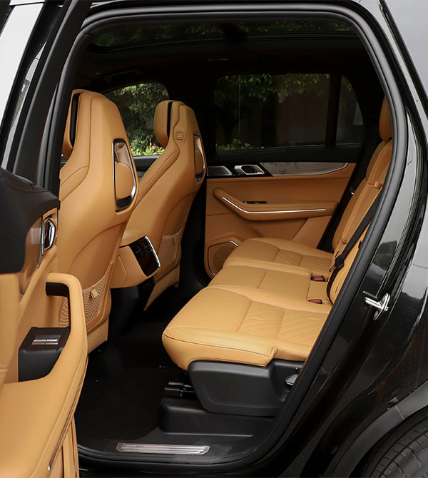 Ergonomic seats feature 16-way electric adjustment, heating, ventilation, and massage for the front, while the rear seats offer sliding and recline adjustment, plus aviation-style headrests and leg supports for first-class comfort. The panoramic sunroof extends above the second row, complemented by multi-color ambient lighting and a 14-speaker BOSE sound system to create an immersive luxury experience.
