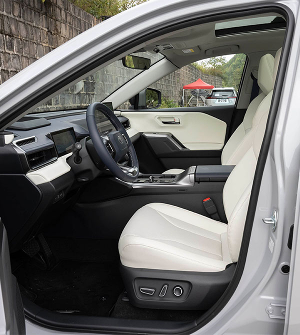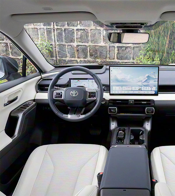 The side profile emphasizes three-dimensionality and strength. The raised hood lines and outward-flared wheel arches deliver a muscular appearance, while the Y-shaped character line—derived from the electric Land Cruiser concept—runs across the body to create a forward-leaning dynamic stance. Wheel size has been significantly upgraded, now offering up to 20-inch wheels compared to the previous maximum of 19 inches, greatly enhancing visual impact. The dimensions (4600/1855/1680 mm; wheelbase 2690 mm) maintain a compact SUV layout, making urban driving and parking agile and convenient. The redesigned rear quarter windows improve passenger visibility, while two-tone body options such as black roof + platinum pearl white add youthful style. The body color shifts under different lighting angles, creating an eye-catching visual effect.