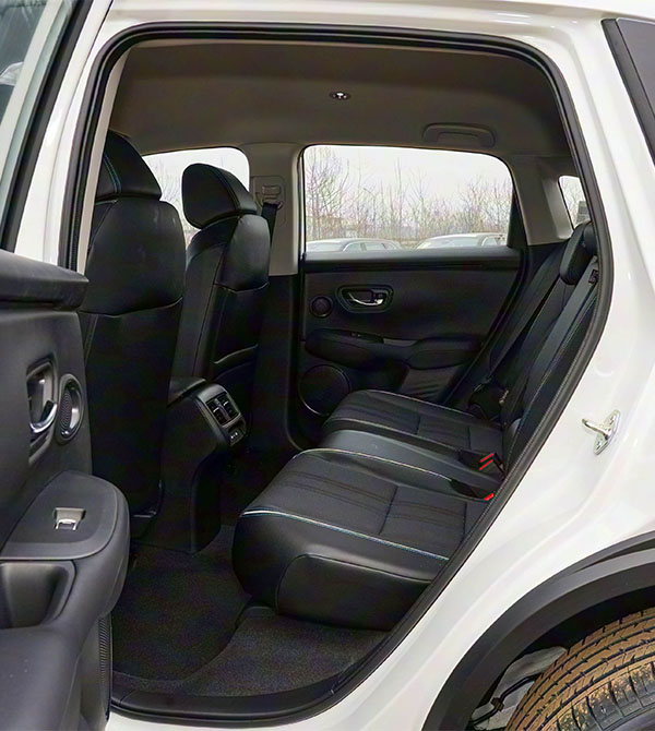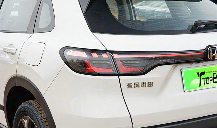 The side profile demonstrates Honda’s mastery of proportions. With a length of 4,569mm and a wheelbase of 2,655mm, it fits standard compact SUV dimensions yet creates an upscale sense of spaciousness through line design. Optional Honda HR-V roof rails enhance practicality for securing luggage racks or bicycles while adding a more sculpted and robust look to the side. The black trim along the lower door edge is the most eye-catching detail, clearly defining body layers and providing scratch protection for everyday use. The roofline gradually slopes downward from the B-pillar, forming a sleek fastback silhouette, improving aesthetics while reducing aerodynamic drag and supporting excellent Honda HR-V mpg performance. The engineers optimized the A-pillar angle, preserving sporty styling without compromising front visibility, avoiding blind spots common in fastback designs. Different Honda HR-V trim levels feature different wheels; mid- to high-end trims come with 18-inch dual-tone low-resistance wheels, paired with 225/55 R18 tires, balancing visual appeal and fuel efficiency, achieving a win-win for style and practicality.