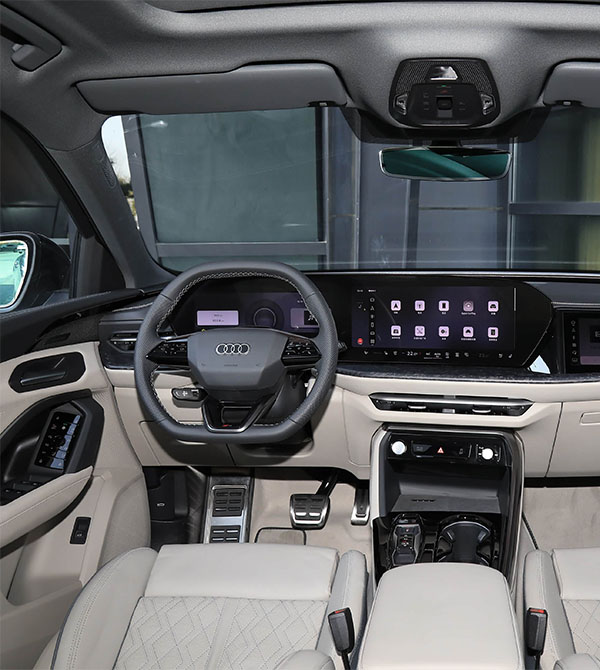Inside, the all-new Audi Q5L receives a comprehensive interior upgrade, using Audi’s latest family design language. The center console tilts toward the driver, paired with a flat-bottom sport steering wheel, creating an immersive driving atmosphere and convenient control of various functions. The interior materials are exquisite, with large areas of soft-touch leather and wood trim wrapped throughout, complemented by fine stitching, providing tactile and visual quality that leads its segment, exuding luxury.