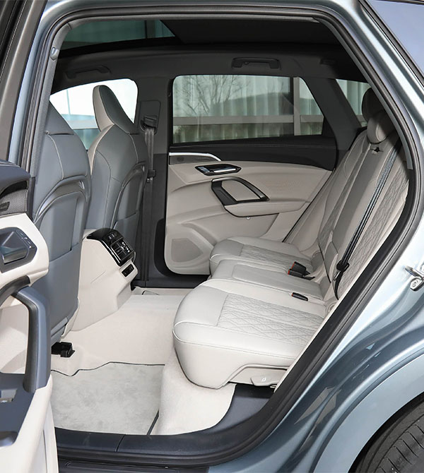 The rear design is simple yet refined, cleverly echoing the front while maintaining Audi’s consistent elegance. A small rear spoiler integrated at the roof edge with a high-mounted brake light optimizes aerodynamics and enhances driving safety. The tail lamps are smoked and through-type, with LED lighting forming a continuous light band that visually stretches the width of the rear, offering high recognition at night.