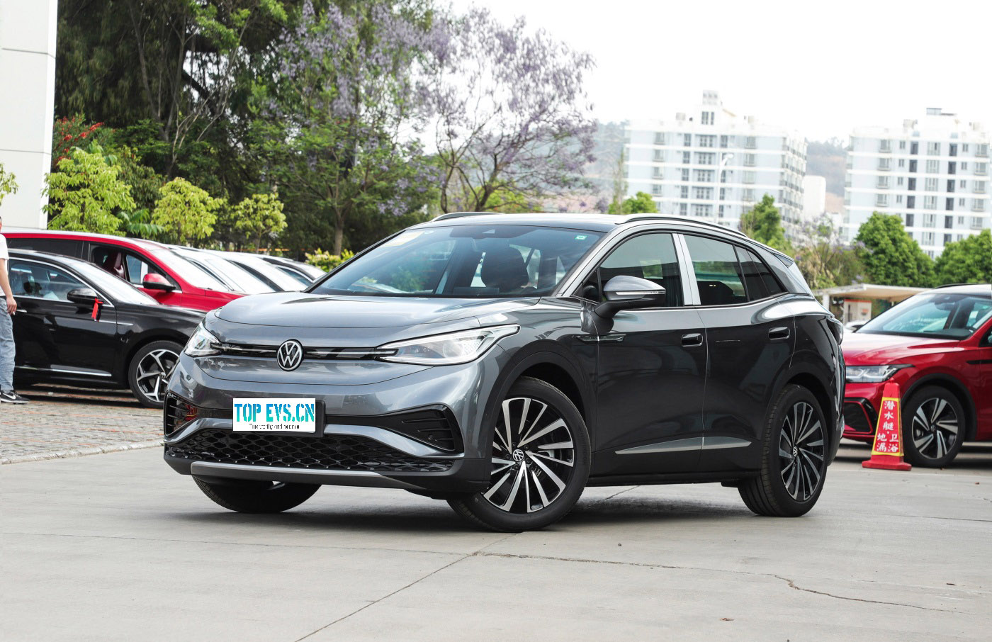 The overall exterior design of this ID.4 X gives you the impression that this is a Volkswagen car and looks rather cute. The front has eagle-eye headlights and is articulated by chrome trim. The headlights on this car are quite well equipped, with matrix led headlights. The fully enclosed front end shows that this is a purely electric model, and it also comes with a blacked-out sports surround to enhance the sporty look.